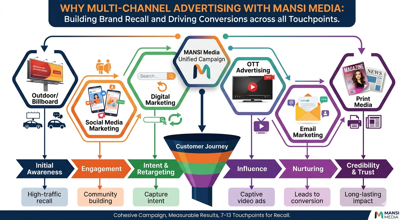MANSI Media’s multi-channel approach ensures your brand message reaches customers wherever they are, creating multiple touchpoints that build awareness, drive engagement, and increase conversions. Our integrated strategy combines Digital Marketing, Email Marketing, OTT (Over-The-Top) Advertising, Print Media, Outdoor/Billboard, and Social Media Marketing into a cohesive campaign that delivers measurable results.
